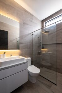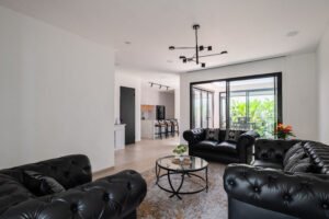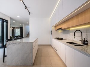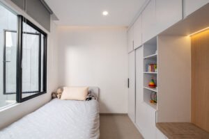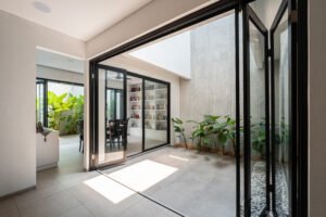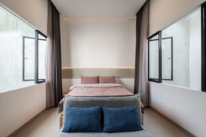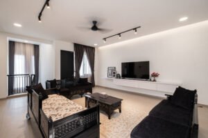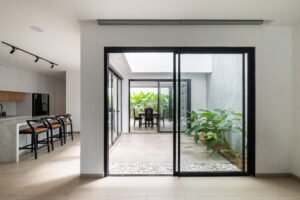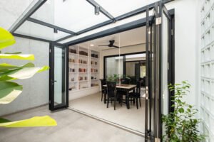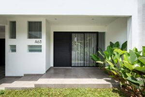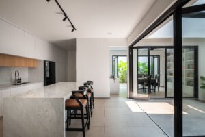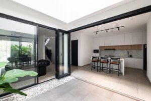 Pemilihan konsep Modern Minimalist dengan menghadirkan banyak bukaan jendela besar yang didominasi warna dasar putih dan aksen hitam, membuat rumah ini menjadi kontras dibandingkan dengan sekitarnya.